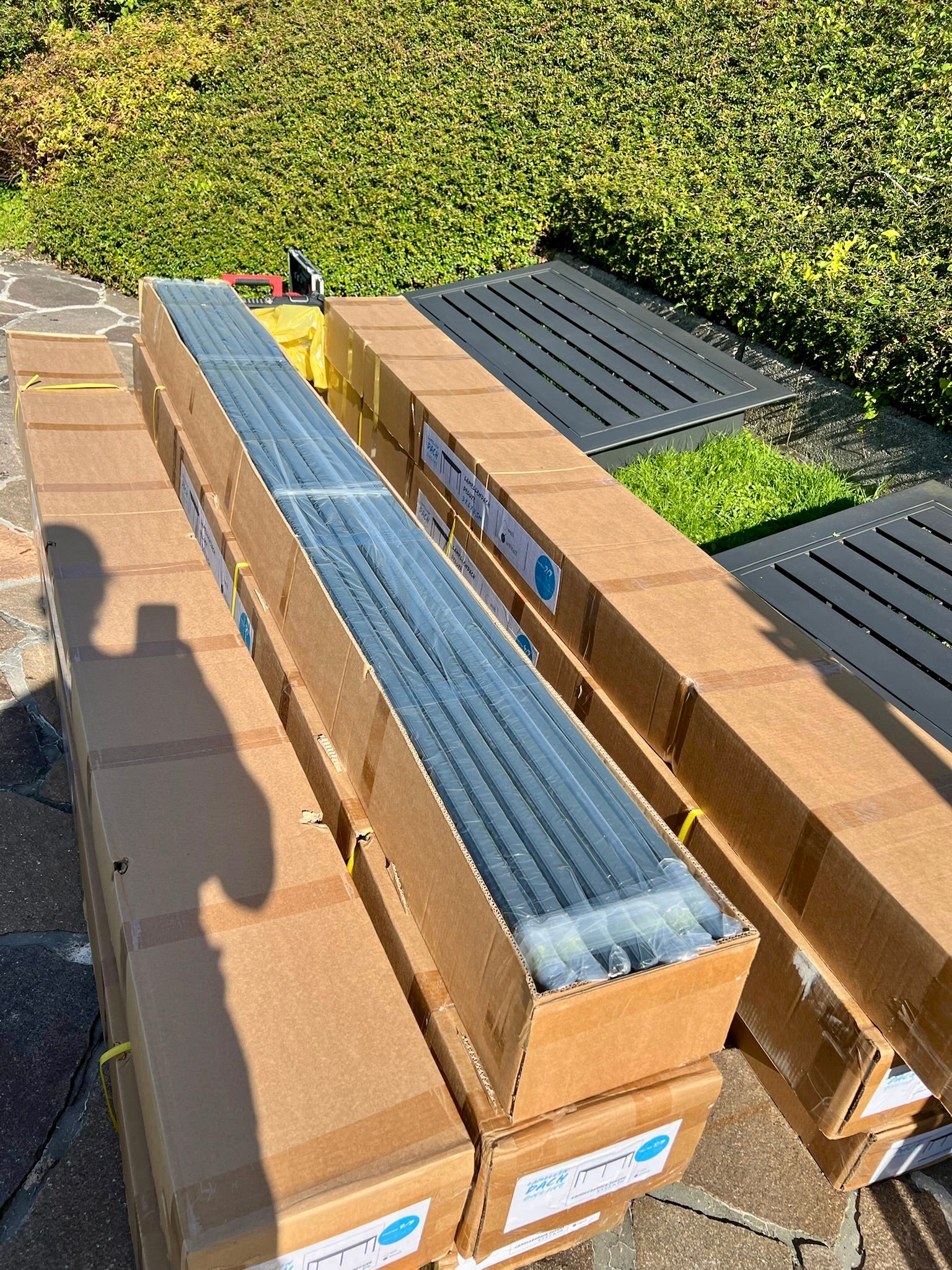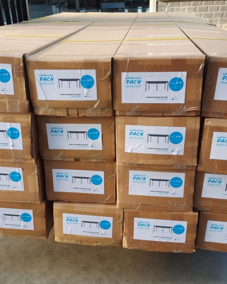 Unsere LAMELLENDÄCHER DELUXE werden sorgfältig verpackt, sodass die einzelnen Packstücke perfekt aufeinander gestapelt werden können.